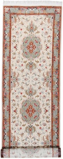 This Tabriz Persian runner rug features a solid 50 raj quality with silk added as highlights. It is everything that the high quality Tabriz rugs are famous for and while it is a fine rug, it is also a high quality piece that is designed to last a lifetime while maintaining the beauty that the high quality Tabriz rugs are known for. The silk is added the design to make them pop out and it is a genuine 50 Raj Tabriz rug with about 350 KPSI. Perfect for hallways with colors that are neutral, Tabriz runners like this one are meant to be walked on for many, many years...